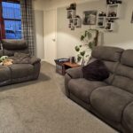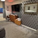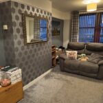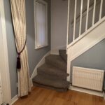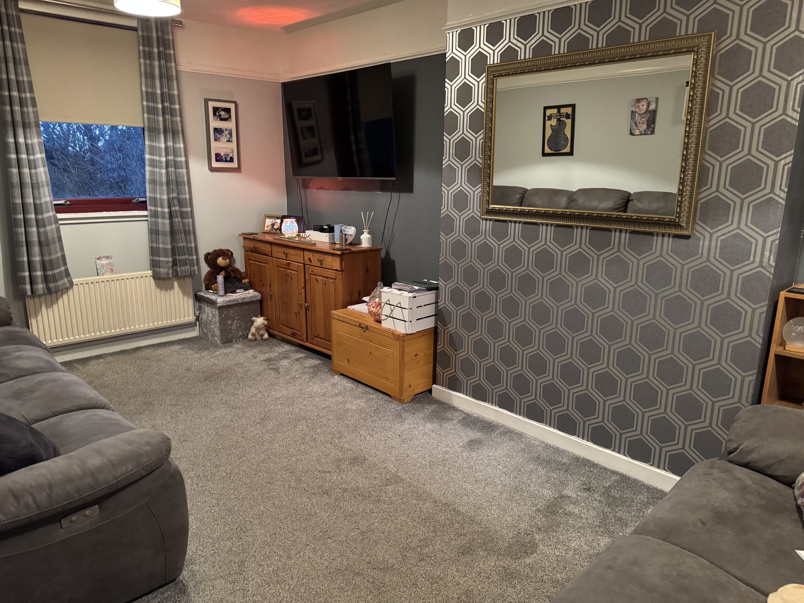This large lounge has double aspect windows with fitted curtains and blinds. The flooring is laid to carpeting and there are two radiators. There is also a dado rail to the upper wall. The fireplace has been blocked off and sealed behind a wall but could be re-opened if required.