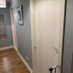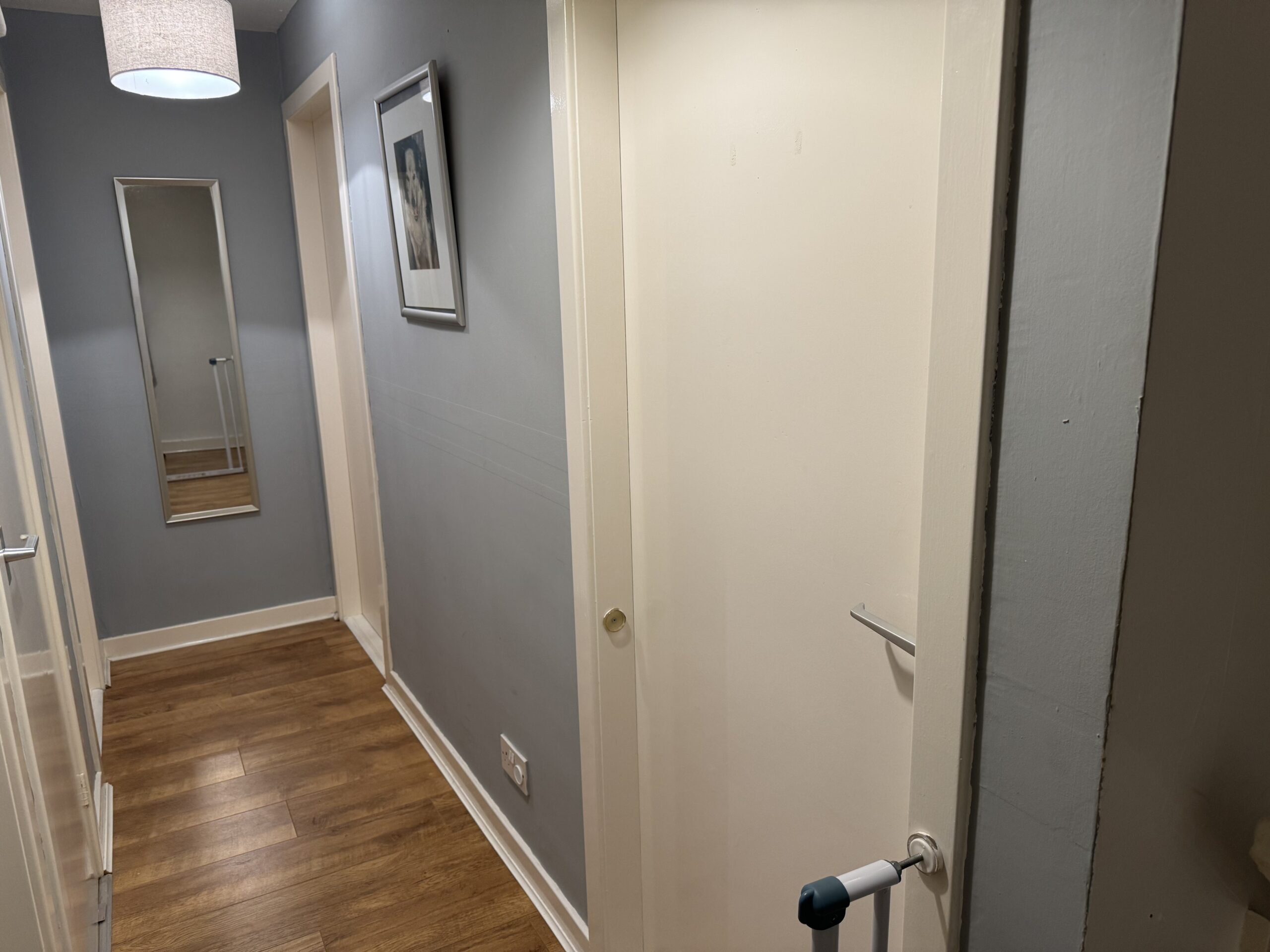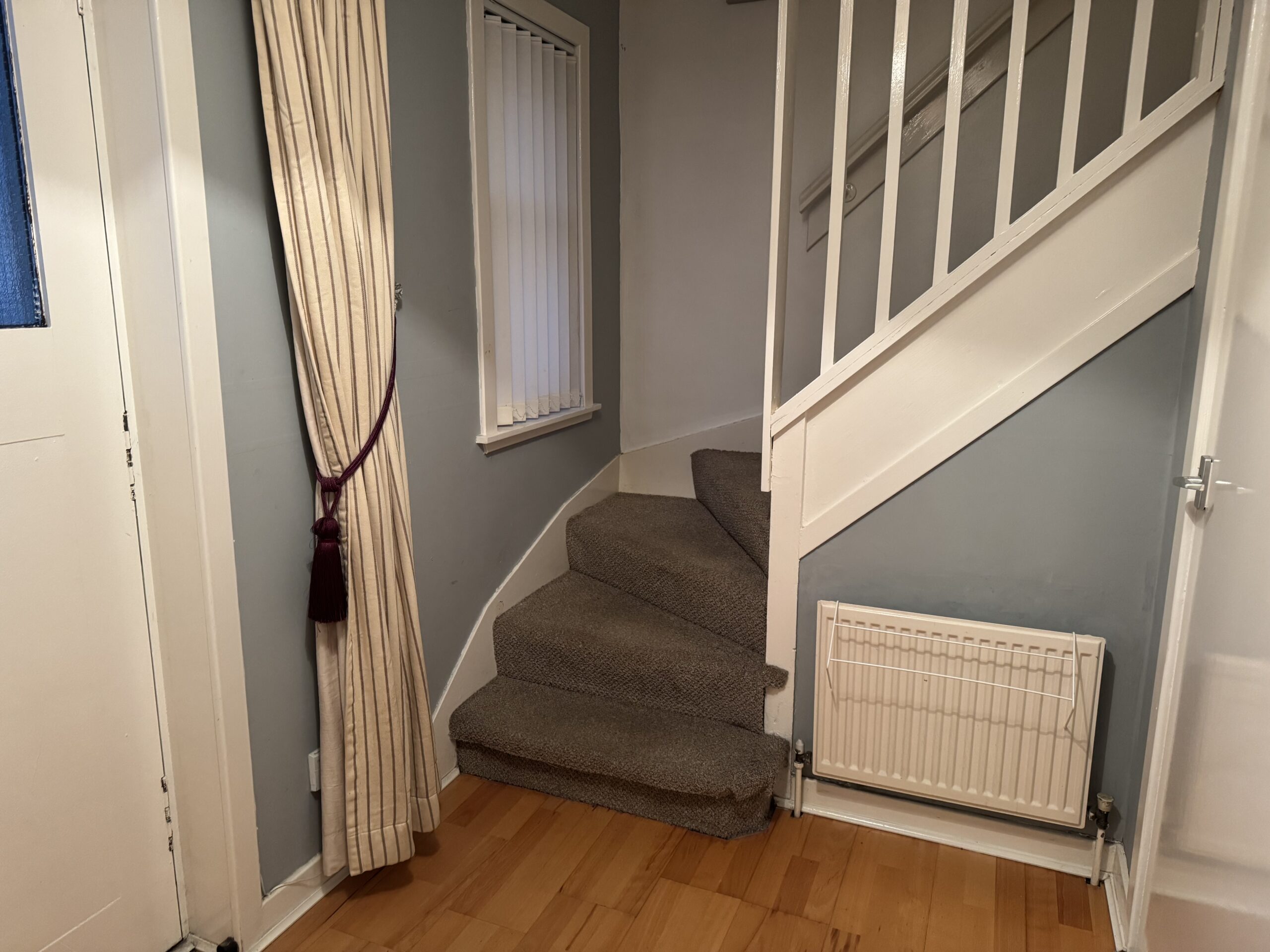 There is a half-glazed timber entrance door into a laminated hallway which has a fitted wardrobe and a radiator to the wall. A staircase leads to the upper floor.