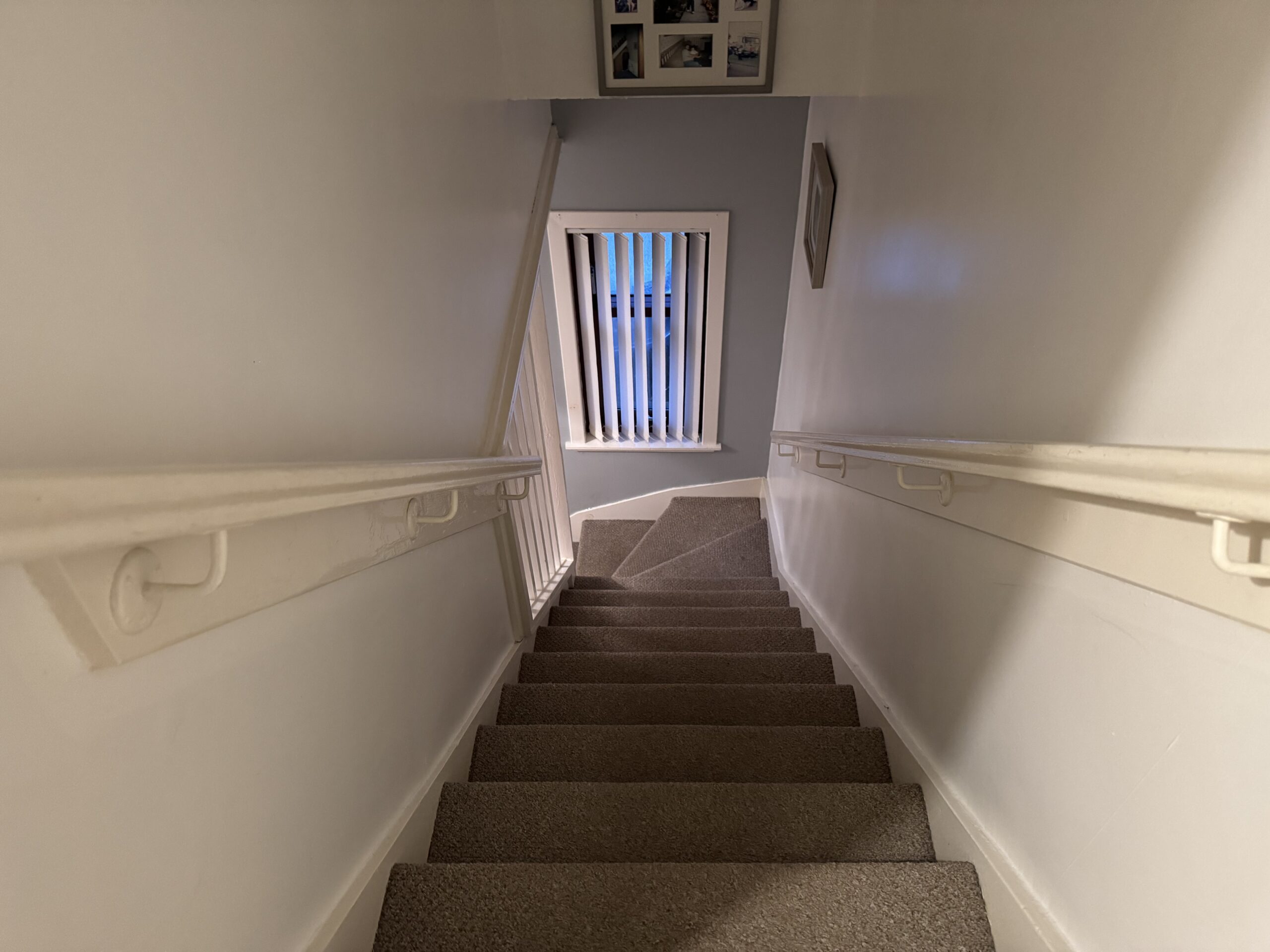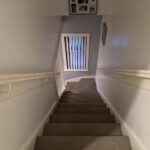 At the bottom of the carpeted staircase there is a window facing to the front. The landing is laid to laminate flooring and there is a built-in shelved storage cupboard. There is a hatch to the attic space which is accessed by the pull-down ladder. The attic is fitted with light and is fully floored.