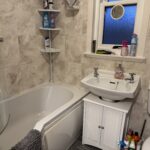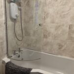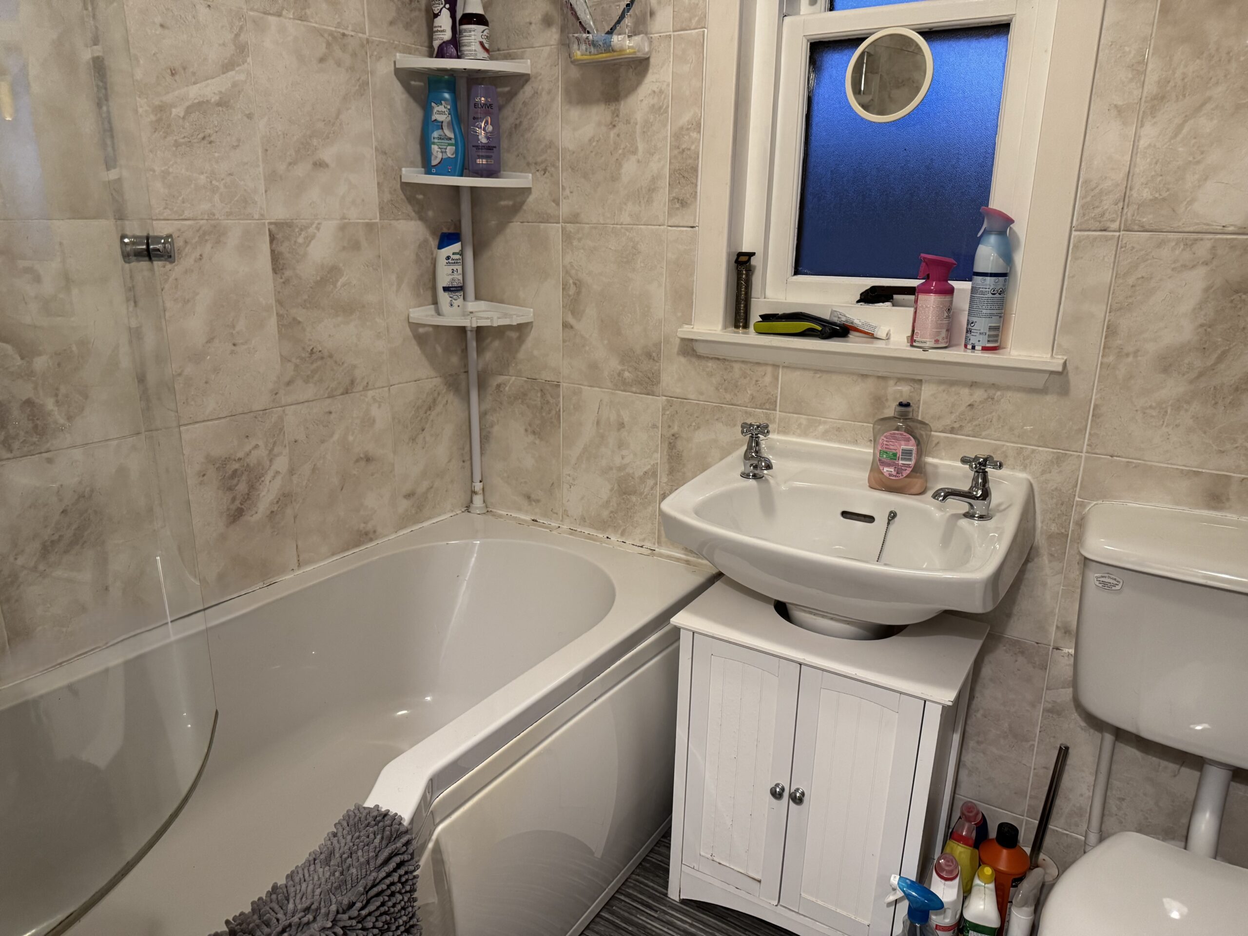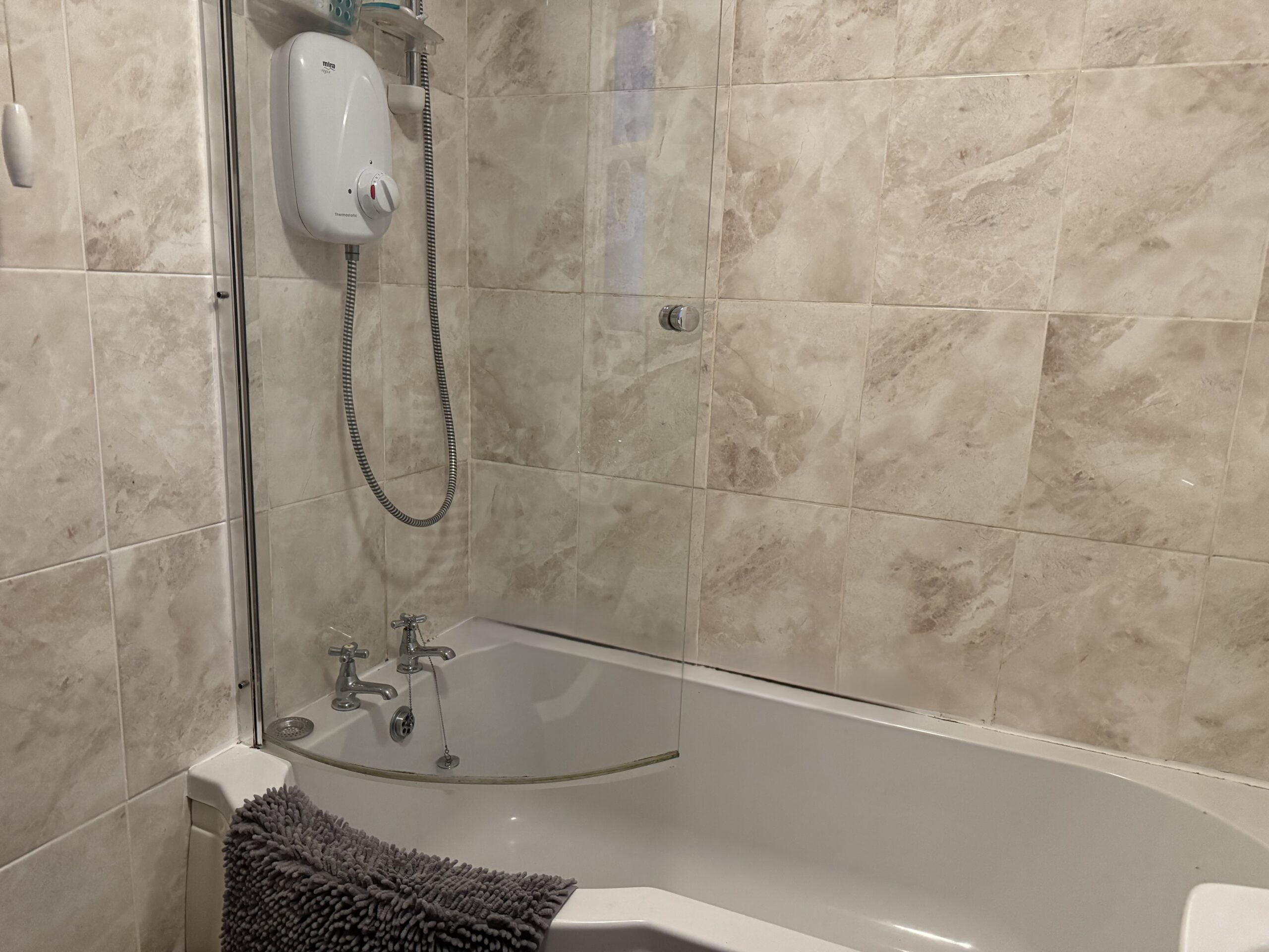 The family bathroom has a three-piece suite comprising a P-shaped bath with Mira electric shower fitted above, glass shower screen and tiling to the walls, W.C. and hand basin. There is an opaque window facing to the rear and a heated towel rail to the wall. The flooring is laid to vinyl and there is an extractor fan fitted to the ceiling.